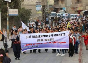 وشارك في التظاهرة المئات من أعضاء المراكز الثقافية والفن في شمال وشرق سوريا، مرتدين الزي الفلكلوري، ومرددين الشعارات التي تندد بالممارسات التركية في المنطقة.