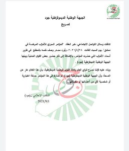 نفت الجبهة الوطنية الديمقراطية “جود”، مشاركتها في “المؤتمر السوري للأحزاب المرخصة” الذي عقد في دمشق الأسبوع الماضي.