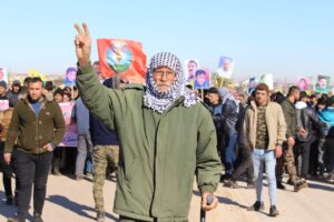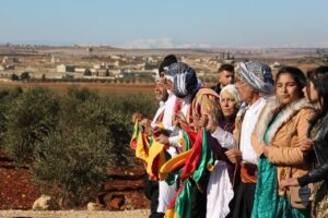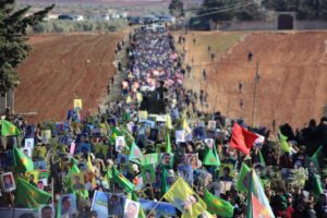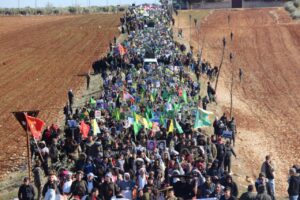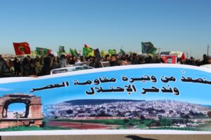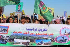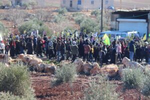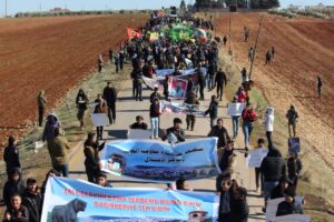 انطلقت التظاهرة من قرية دير جمال، وجابت شوارعها الرئيسية، ثم سارت على الطريق الدولي الواصل إلى عفرين، ومرت على “مخيم العودة” لنازحي عفرين، الذين انضموا إلى التظاهرة.