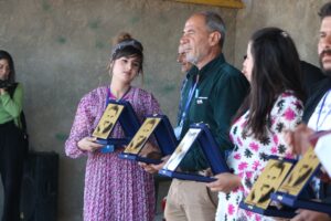 ثم تم تكريم المشاركين في رسم اللوحة وهم 15 شخصاً، بينهم كبار وصغار من خلال لوحة رمزية.