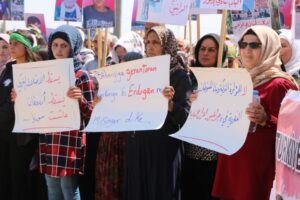 ورفع المتظاهرين صور لمجازر والجرائم التركية في المناطق السورية التي تسيطر عليها من قتل للأطفال والنساء، ولافتات كتبت عليها شعارات منددة بالوجود التركي وجرائمه وتطالب بإخراجها من الأراضي السورية.