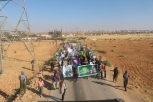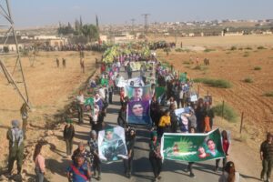 رفع المتظاهرون “أعلام مؤتمر ستار، مجلس المرأة الحرة للشهباء، صور شهيدات مجزرة حلنج” وغيرهن من شهيدات الثورة في شمال شرق سوريا.