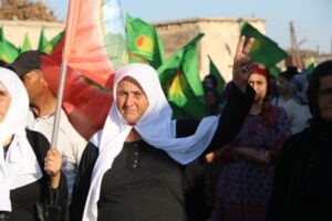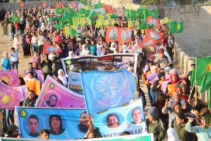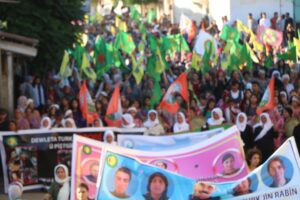 تحت شعار “أوقفوا إرهاب الدولة التركية على النساء” تظاهر يوم أمس، الآلاف من نساء أهالي ومهجري مقاطعتي عفرين والشهباء.