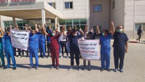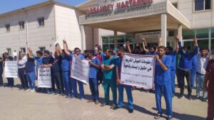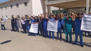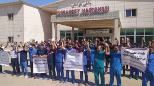 نظم الكادر الطبي والإداري في “المشفى العسكري” بمقاطعة عفرين في شمال وشرق سوريا التابعة للسلطات التركية وقفة احتجاجية بعد ضعف وانهيار الواقع الصحي في المقاطعة.