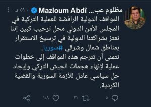 وقال مظلوم عبدي في تغريدته “المواقف الدولية الرافضة للعملية التركية في المجلس الأمن الدولي محل ترحيب كبير. إننا نعتز بشراكتنا الدولية في ترسيخ الاستقرار بمناطق شمال وشرقي سوريا”.
