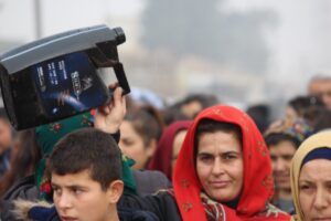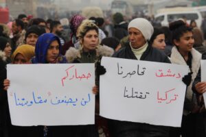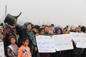تظاهر اليوم الآلاف من مهجري عفرين في الشهباء وأهالي المقاطعة أمام حاجز لقوات حكومة دمشق الواقع بين طريق حلب- الشهباء، تنديداً بالحصار المفروض على المنقطة من قبل حكومة دمشق.