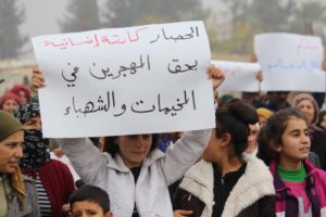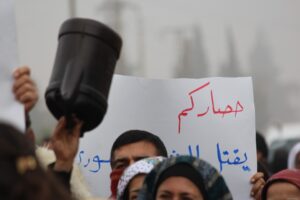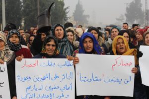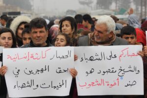وفي التظاهرة التي نظمت في ناحية أحداث في الشهباء وطريق مدينة حلب ردد المشاركون الشعارات التالية ” لا للحصار”، “حصاركم لن يكسر من إرادتنا”، “تحيا مقاطعة الشعب في الشهباء”.