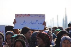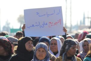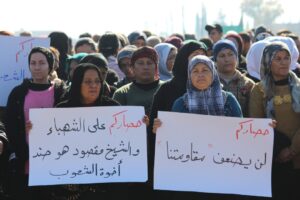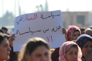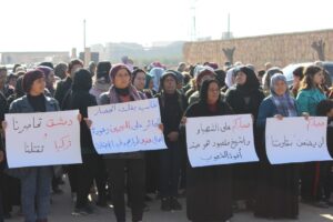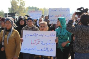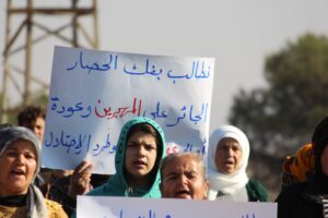 تظاهر مهجرو عفرين وأهالي الشهباء لليوم الثالث رفضاً للحصار الخانق على المقاطعة من قبل حكومة دمشق، وذلك أمام قاعدة القوات الروسية في قرية وحشية.