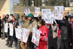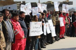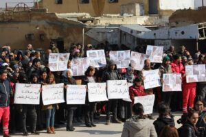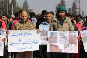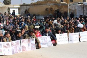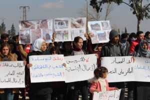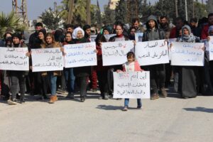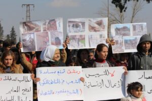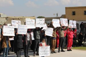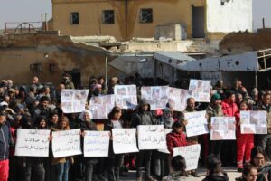 خرج مهجرو عفرين وأهالي الشهباء بتظاهرة أمام حاجز لقوات حكومة دمشق الواقع على الطريق الواصل بين مدينة حلب والشهباء وطالبوا بفك الحصار.